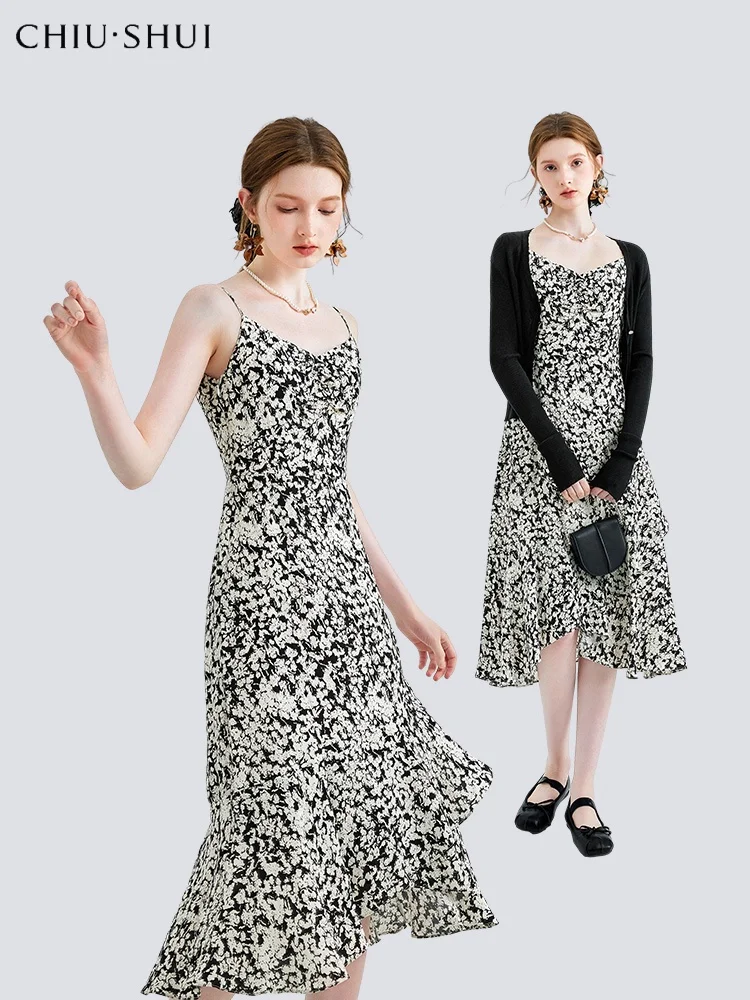 Autumn New Fashionable Cardigan Suspender Dress Elegant All-Match Slim Suit for Women Casual Floral Skinny